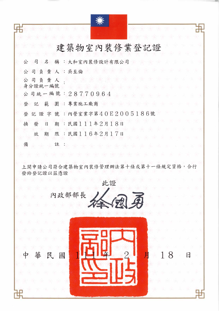 大和室內裝修設計有限公司創立於民國九十六年,為一家領有各項法定證照並擁有建築物室內裝修業登記證的專業服務供應商。